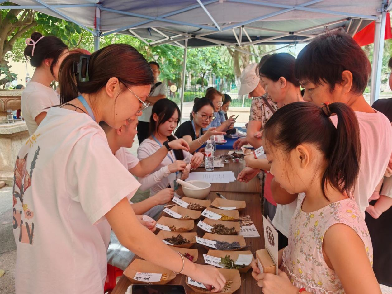实践队志愿者们先是参观了广西中医药大学仙葫校区中药、民族药辨识馆,系统了解了中药起源、发展历程以及常见中药的性味、功效;然后分2个批次前往南宁市青秀区龙祥社区开展活动,通过设立多个中医体验区,向社区居民普及中医“治未病”理念和夏季养生知识,内容包括香囊药材功能介绍、茶包各药材效用普及、常见药材功效及使用搭配等。居民们在志愿者一对一指导下,亲身体验中药材香囊搭配及药茶配制等中医特色技术,现场互动频繁,气氛热烈。