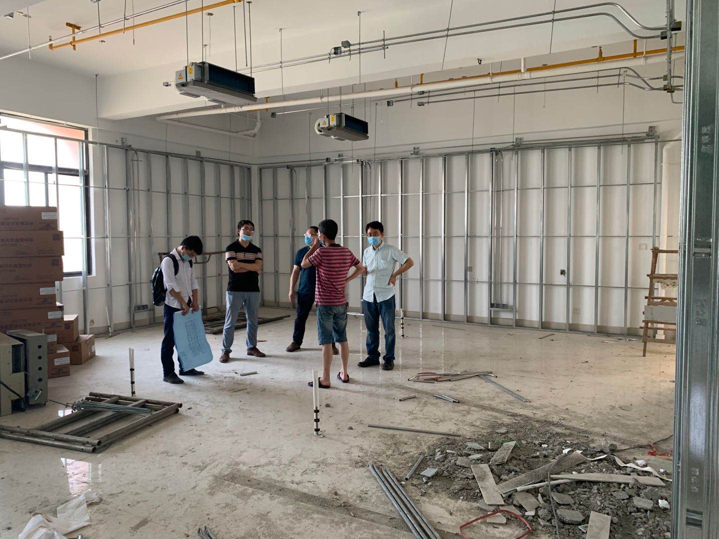 2020年5月5日下午,我院李海副院长在预防医学系马金凤、覃光球、熊润松等老师陪同下与基建处唐龙科长、教学实验实训中心包传红老师及施工方相关技术人员一起到预防医学实验室进行现场办公,以期推动实验室装修建设,尽快投入使用。