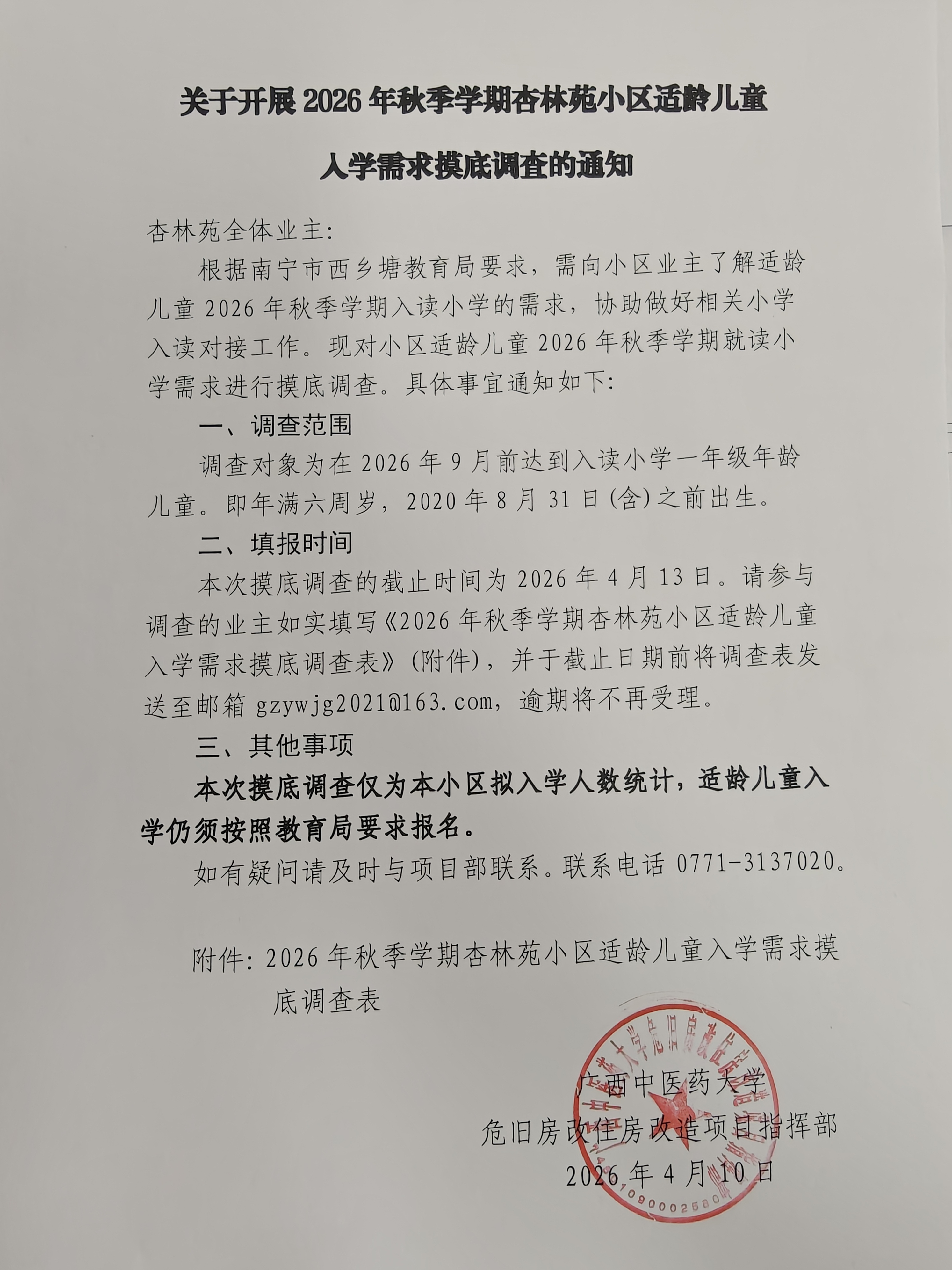 关于开展2026年秋季学期杏林苑小区适龄儿童入学需求摸底调查的通知 发布时间:2026-04-10 18:00:24 浏览次数: 次 【字体:小 大】 关于开展2026年秋季学期杏林苑小区适龄儿童入学需求摸底调查的通知 附件:摸底调查表.docx 分享到: 【打印正文】