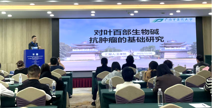 快讯:王孝勋研究员出席世界中医药学会联合会中药鉴定专业委员会第十一届学术年会暨中国民族医药学会方药量效研究分会2025年学术年会并作学术报告 发布时间:2025-12-01 17:09:42 浏览次数: 次 【字体:小 大】 2025年11月30日,广西中医药大学中医药壮瑶医药研究院院长、我平台学术带头人王孝勋研究员参加世界中医药学会联合会中药鉴定专业委员会第十一届学术年会暨中国民族医药学会方药量效研究分会2025年学术年会,并在大会上作报告,题为“对叶百部生物碱抗肿瘤的基础研究”。 分享到: 【打印正文】