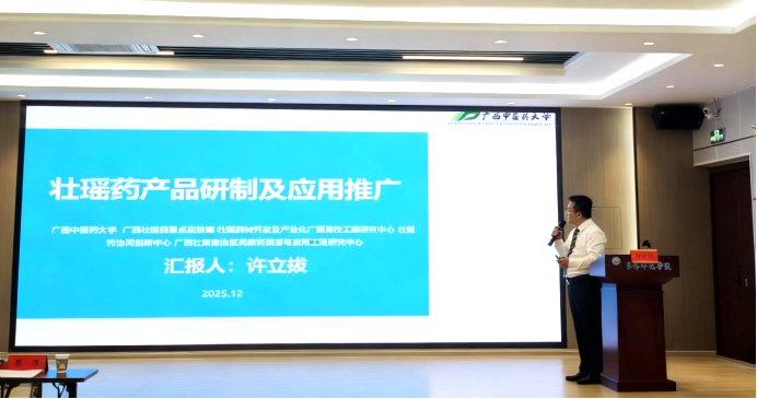 我平台受邀参加此次活动,实验室骨干许立拔老师在“高校院所中医药健康及相关领域技术创新成果路演”环节中,围绕“壮瑶药产品研制及应用推广”主题作专题报告。报告系统梳理了我平台近年来在壮瑶药理论挖掘、药材资源开发、制剂工艺创新以及产业化推进等方面取得的研究成果,重点展示了多个具有自主知识产权的中药复方制剂研发项目,涵盖抗炎镇痛、调理脾胃、增强免疫力等多个方向,充分体现了我平台在民族医药领域的科技创新能力与实践转化潜力。