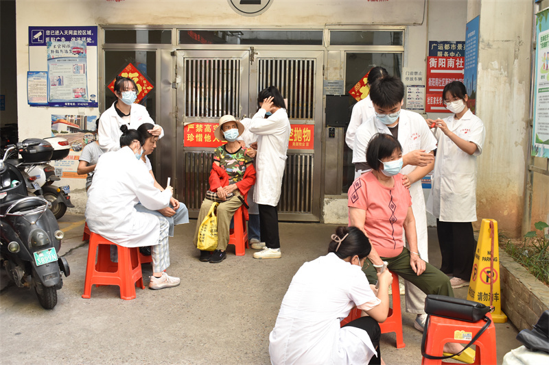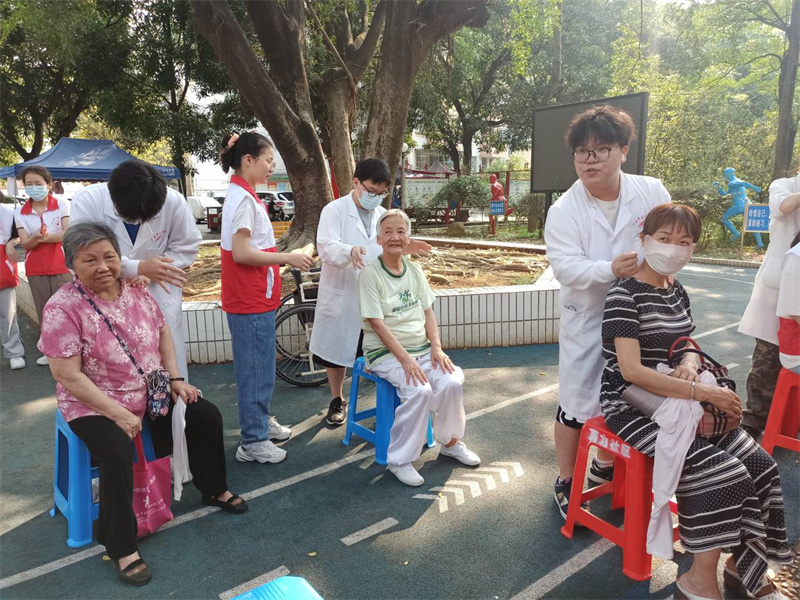 当天上午,义诊团队分批前往万力社区和衡阳南社区同时开展义诊活动。在衡阳南社区,治未病中心闫金星医师、泌尿外科张鑫医师等专家们为到场的社区居民提供医疗咨询服务,热情解答群众提出的常见病、多发病、老年病等健康问题,讲解相关疾病的日常保健和预防知识,提供健康饮食和用药指导,为群众答疑解惑。同时现场还设有手法按摩、量血压、急救知识宣讲等项目,让社区居民在家门口就能享受到专业的服务。在万力社区,志愿者们向现场的居民宣讲了心肺复苏和人工呼吸等方面的健康科普知识,提高居民的健康意识,倡导健康的生活方式,受到社区居民的欢迎和赞誉。