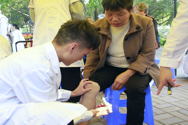 志愿者为老人们进行艾灸
