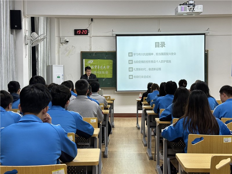 会上,钟远鸣用第一附属医院在抗疫、防疫投入的人力、防疫药品和物资,援鄂援边医疗队的真实事迹,“乙类乙管”后医院的抗疫历程,让同学们深刻的感受到了国家坚持人民至上,生命至上,为保护人民的健康,付出的巨大努力和取得的不凡成就。希望同学们学会感恩国家,珍惜现在的生活。作为未来的医务工作者,要珍惜大学在校学习时光,扎实学好理论知识,做好学业规划。并结合近年来新的就业形势,希望同学们提早谋划考研、规培、就业等职业规划,鼓励同学们扎根基层医院,用自己所学在地方干出一番事业。