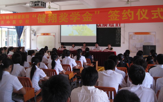 2010年6月3日上午9时,广东佛山市健翔颈腰医院、广西中医学校“健翔奖学金”设立签约仪式在广西中医学校北湖校区隆重举行。出席签约仪式现场的领导嘉宾有广东佛山市健翔颈腰医院院长龙翔宇、办公室主任冯秀娟,广西中医学校校长吴彬、党委副书记罗艺徽、副校长周琦以及学校师生代表共100多人参加签约仪式。广东佛山市健翔颈腰医院院长龙翔宇、广西中医学校校长吴彬做了重要地讲话。