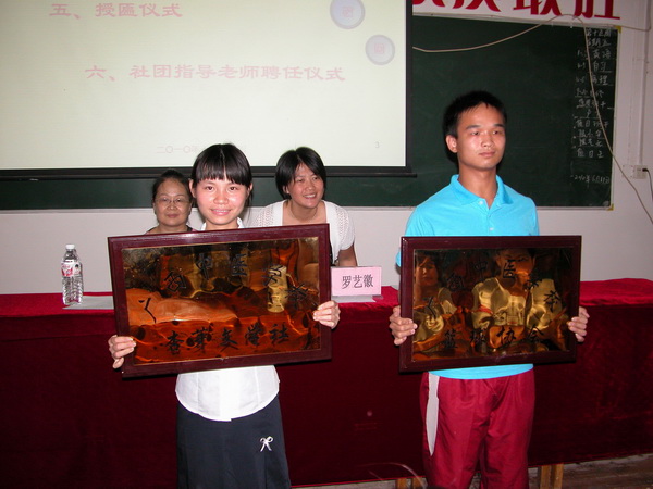 紧接着学校党委罗艺徽副书记为“杏芽文学社”、 “篮球协会”授匾。学校党委罗艺徽副书记、学生科黄勇科长、学生科江育萍副科长为各社团指导老师颁发聘书。