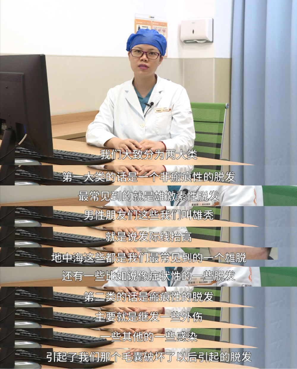 脱发有很多种类型,大致分为瘢痕性秃发和非瘢痕性秃发(常见雄秃、休止期脱发和斑秃),病因也各不相同。