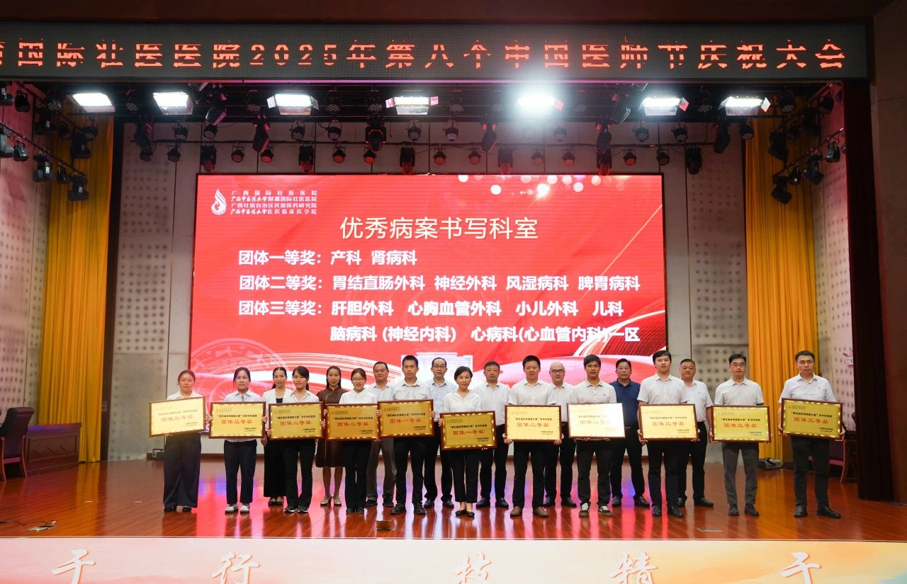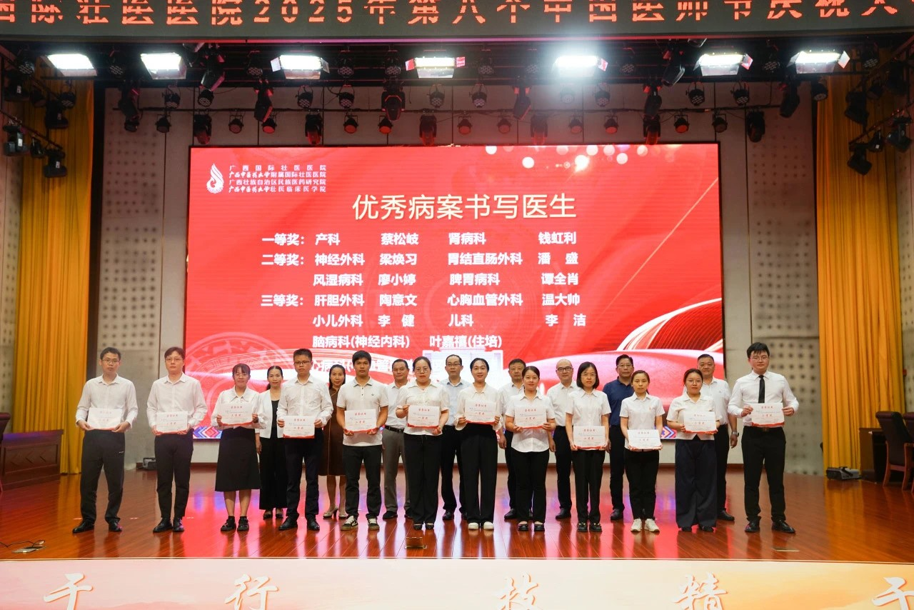 8月19日下午,时值第八个“中国医师节”之际,附属国际壮医医院举行庆祝活动暨第五届优秀病案大赛表彰大会。广西中医药大学党委常委、副校长唐振宇,医院党委书记秦祖杰,党委副书记、院长黄国东等领导班子成员为获奖医生、科室代表颁发荣誉证书。党委副书记吴光宣读了表彰名单。