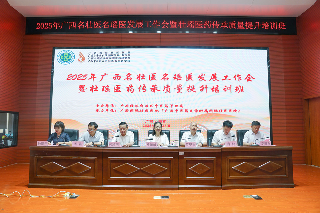 8月23日至24日,由自治区中医药局主办、广西国际壮医医院承办的2025年广西名壮医名瑶医发展工作会暨壮瑶医药传承质量提升培训班在广西国际壮医医院召开。国家中医药管理局中西医结合与少数民族医药司副司长欧阳波、国医大师黄瑾明出席并授课,自治区卫生健康委党组成员、自治区中医药局党组书记、局长黎甲文,广西中医药大学党委常委、副校长肖健出席开班式并讲话。自治区中医药局党组成员、副局长潘霜,自治区中医药局、广西中医药大学有关处室负责同志,广西国际壮医医院在家领导班子成员一同参加。