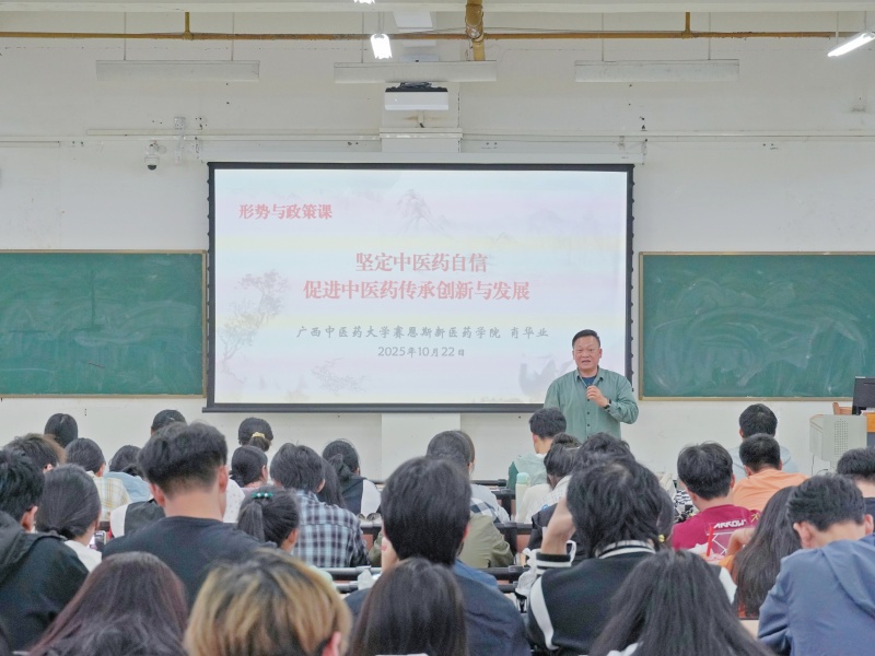 为进一步贯彻落实习近平总书记对学校思政课建设作出的重要指示,帮助青年学子了解世情、国情和党情,坚定理想信念、增强社会责任感精神,10月22日晚,赛恩斯新医药学院党委书记肖华业以《坚定中医药自信,促进中医药传承创新与发展》为题,为2025级中医学专业1、2班学生讲授了一堂生动精彩的形势与政策课。