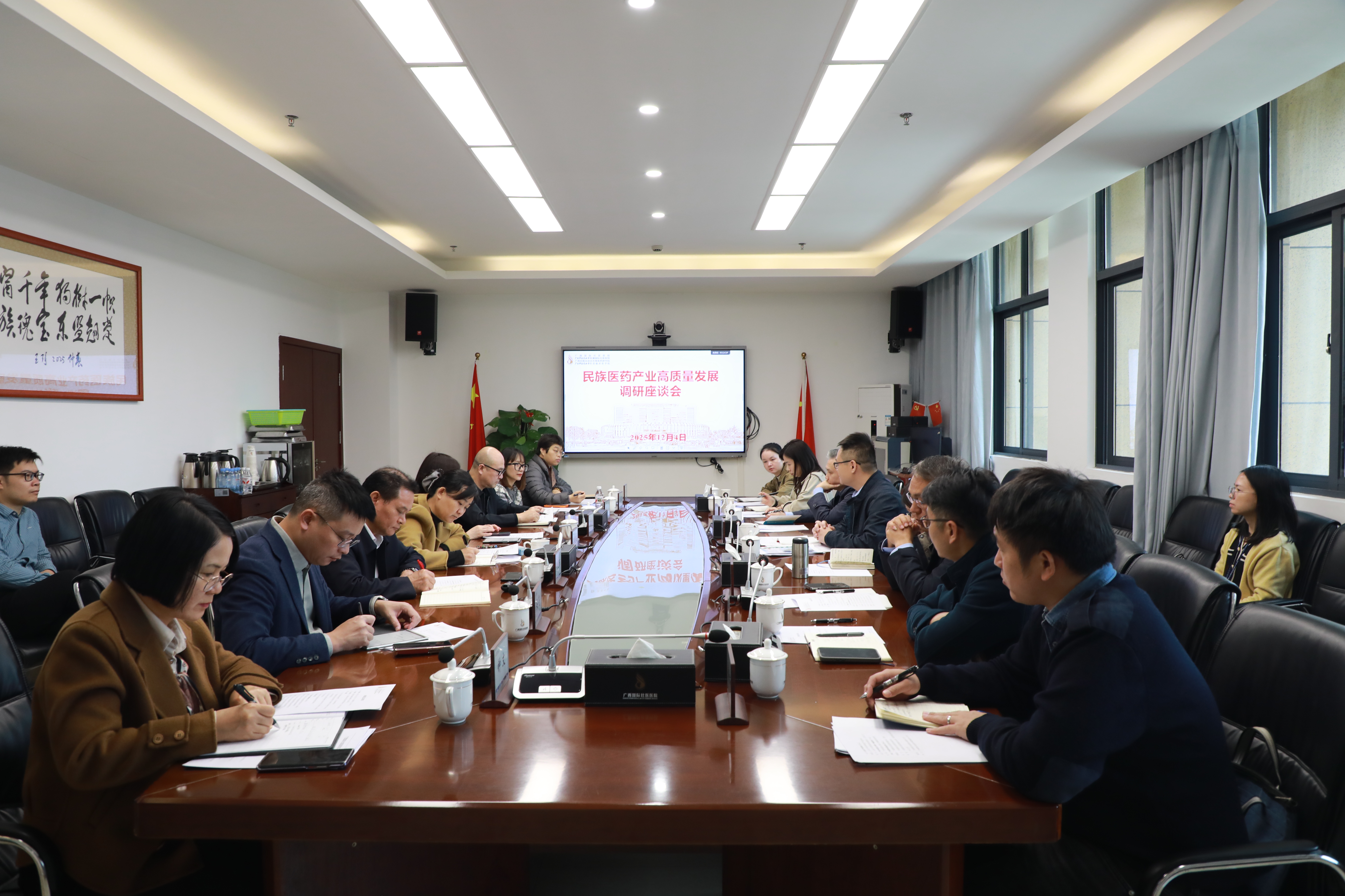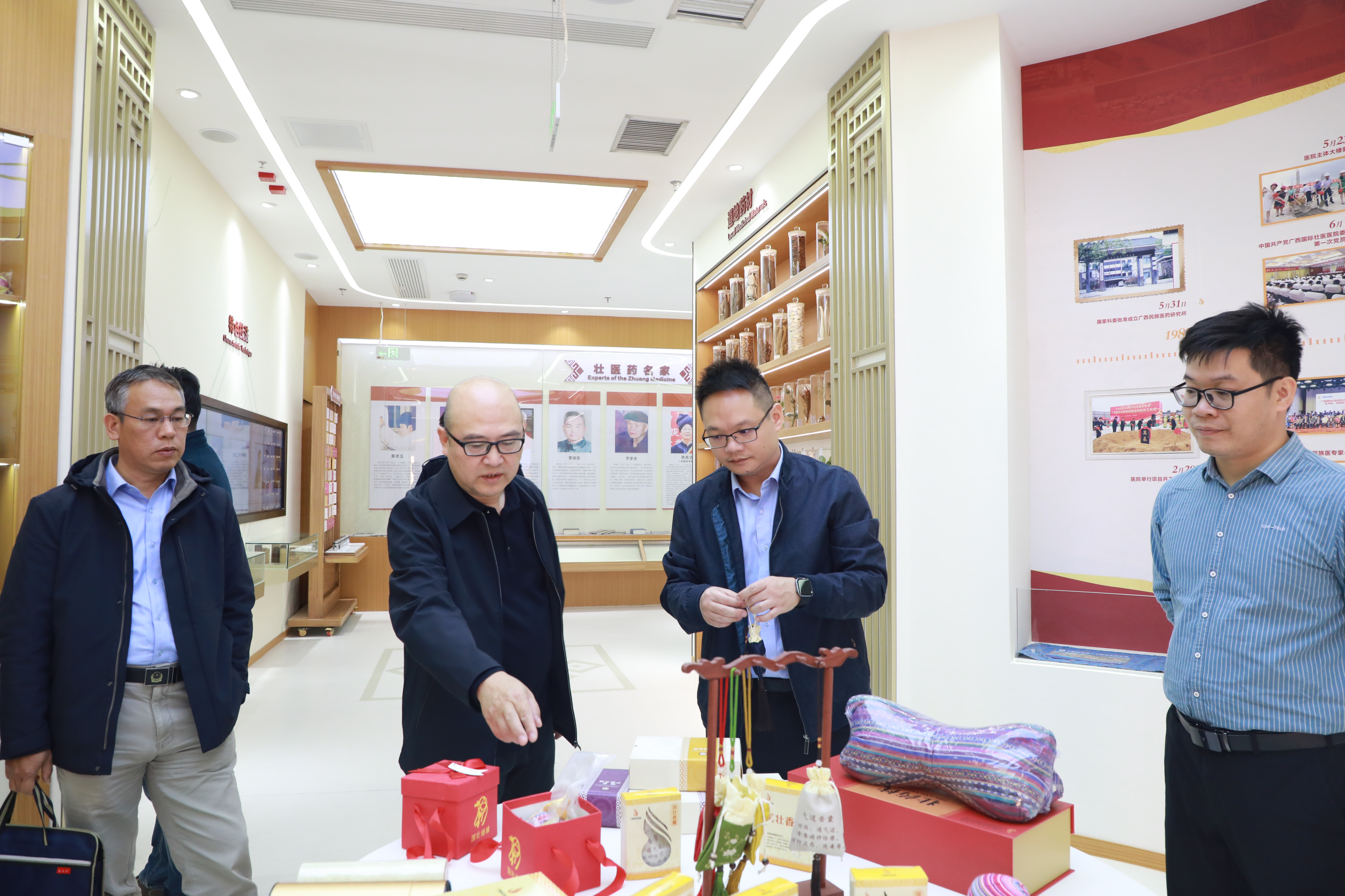 南宁市市场监管局调研组到国壮参观调研 日期:2025-12-05 点击数: 次 分享到: 12月4日上午,南宁市市场监管局调研组到广西国际壮医医院了解民族医药产业发展情况。自治区中医药局规划产业处处长谷筱玉,广西国际壮医医院党委副书记、院长黄国东,党委副书记吴光参加。座谈会上,双方围绕文创产品合规管理、医院协定方监管、知识产权保护等方面进行了深入交流。▲座谈会现场 ▲会后,调研组进行了实地参观。 打印正文 关闭本页