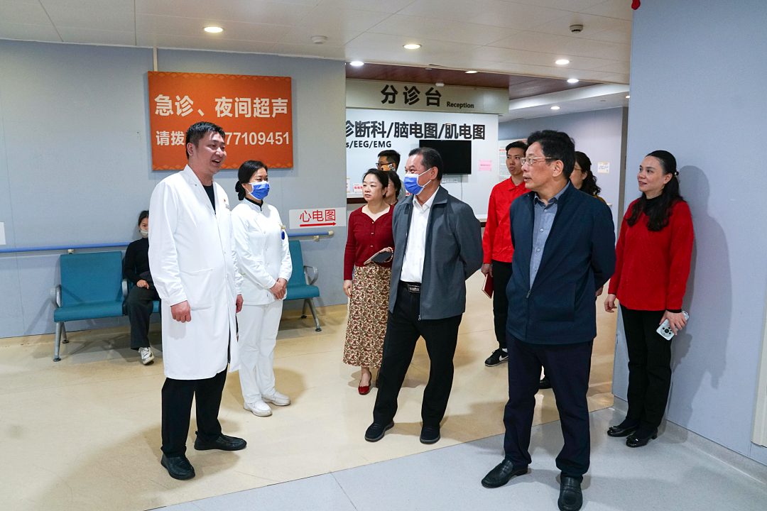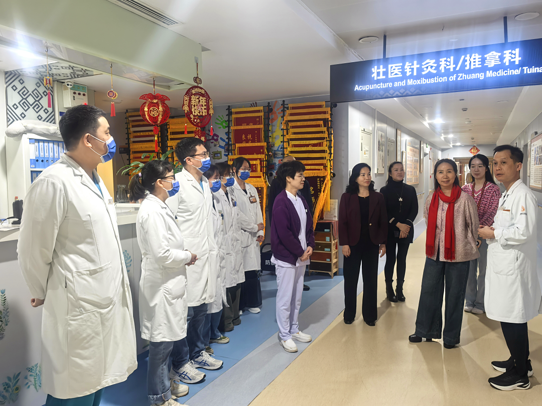 2月24日,春节假期后首个工作日,广西国际壮医医院党委书记秦祖杰,党委副书记、院长黄国东,党委副书记吴光,副院长陈日兰,副院长、总会计师庞刚,纪委书记陈俐,副院长何贵新、张荣臻等院领导带队,深入全院各临床科室、医技辅助科室,走访慰问一线职工,为大家开启新一年的工作鼓劲加油。