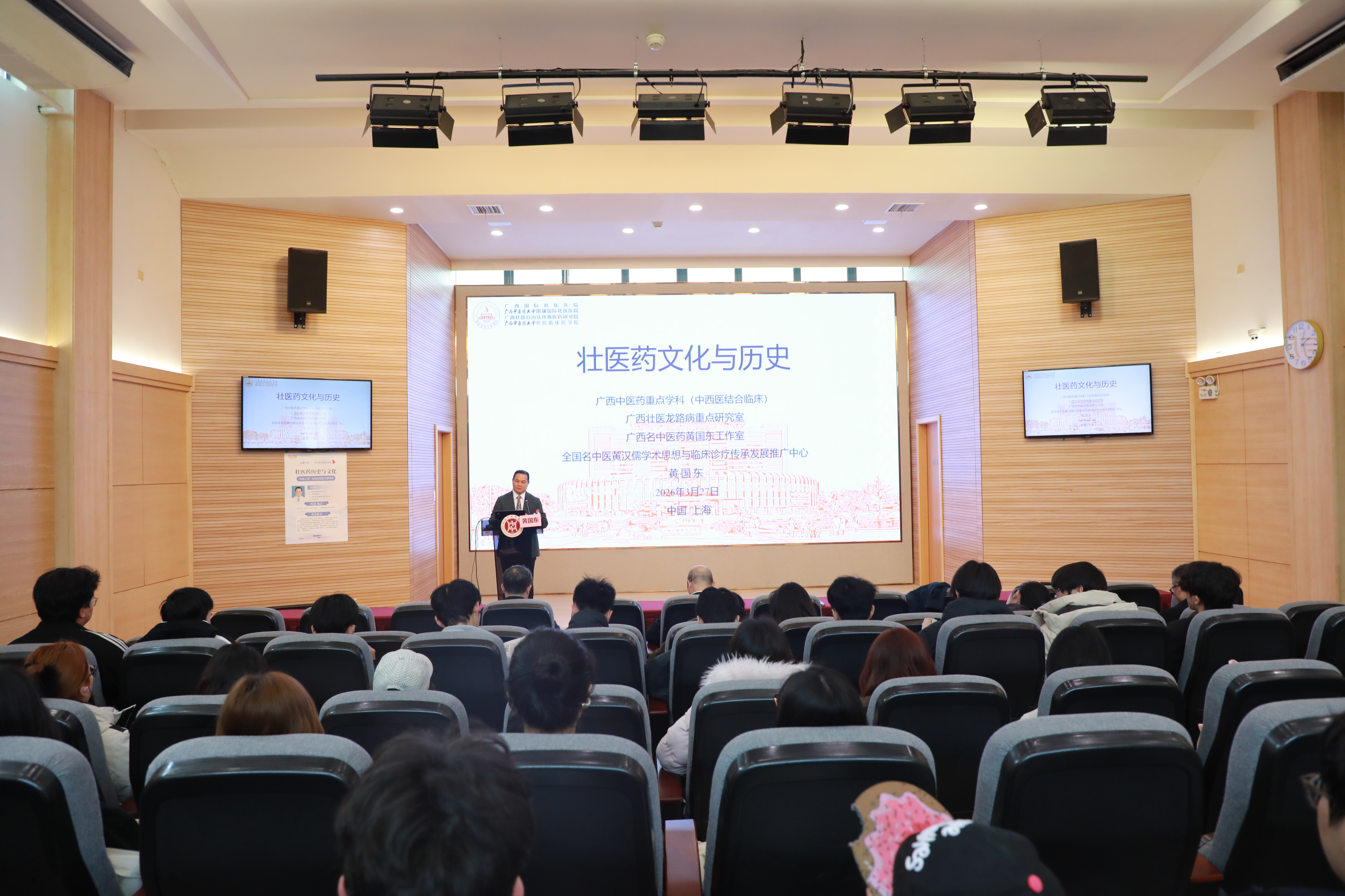在上海中医药大学全球伙伴中心报告厅,黄国东作“壮医药历史与文化”专题讲座,从壮医药文化的发展载体、发展历程、时代回响三大维度,系统阐释布洛陀文化、骆越文化等壮族传统文化与壮医药的深度交融,为在场师生揭开壮医药的神秘面纱。