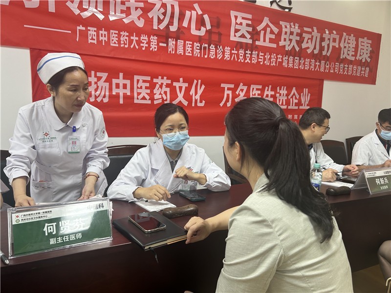 为深入践行“为民办实事”,把优质医疗服务送到企业职工身边,4月22日,第一附属医院门急诊党总支第六党支部联合广西北投产城投资集团有限公司北部湾大厦分公司党支部,在北部湾大厦南四楼举办“党建引领践初心 医企联动护健康”主题义诊活动。