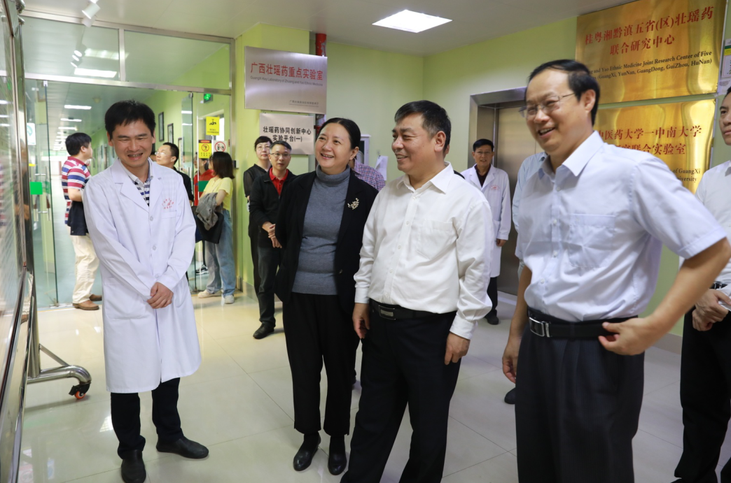 在学校党委副书记庞宇舟,广西中医药管理局党组书记、局长黎甲文,副局长范春,附属国际壮医医院党委书记秦祖杰、副院长李铭等的陪同下,闫树江一行到附属国际壮医医院调研,实地参观考察了壮医药线点灸疗法、壮医药物竹罐疗法、壮医脐环穴针刺疗法、壮医目诊、壮医水蛭疗法,并深入壮瑶药房考察了中医药、壮瑶医药的药材分类、药材质量、使用情况等。