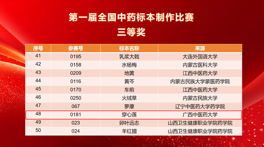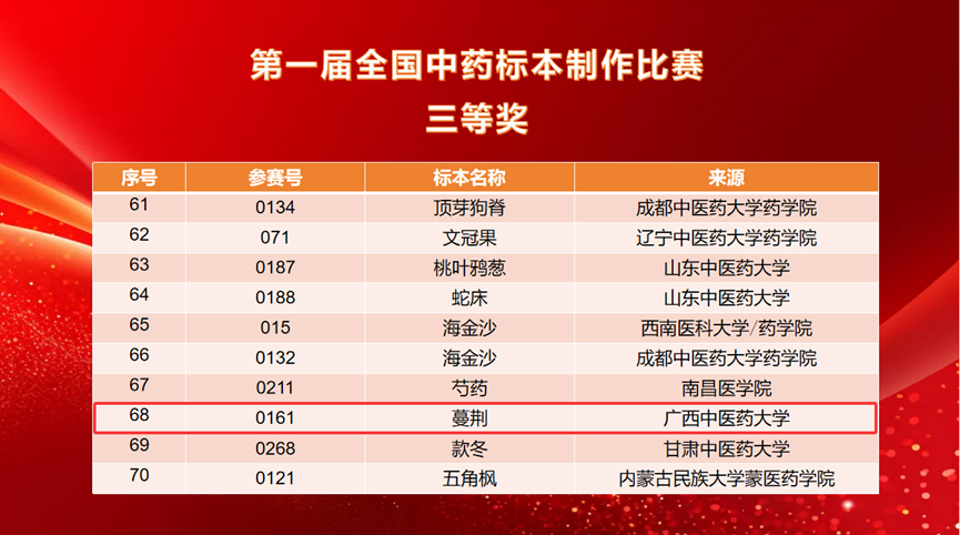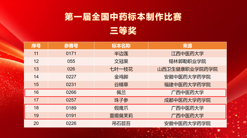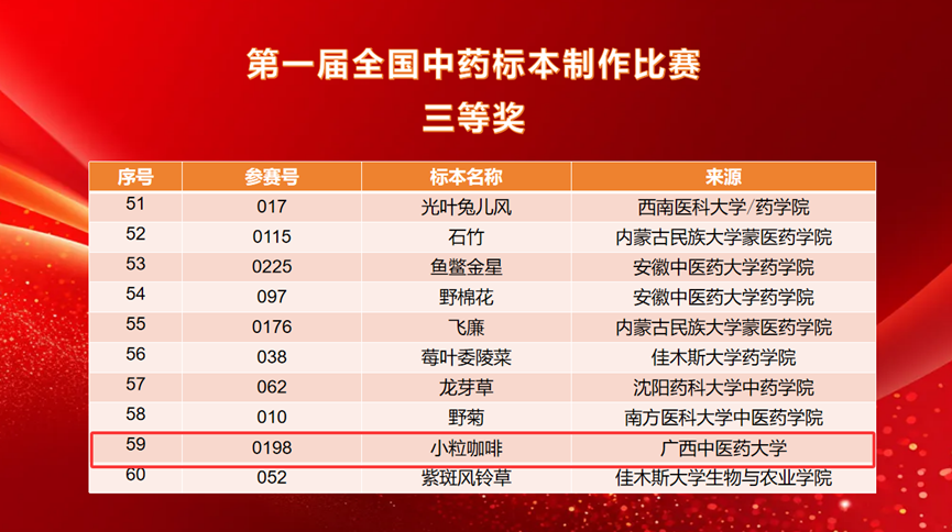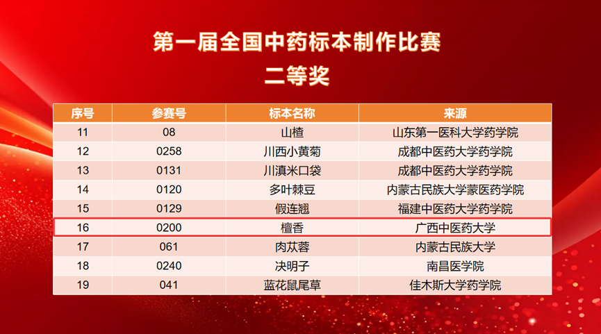 经过前期的精心准备与选拔,我校壮瑶药研究平台派出3名教师带队,11名研究生参赛,共提交16件标本作品。其中,药用植物标本《檀香》荣获二等奖,《假鹰爪》《重瓣臭茉莉》《穿心莲》《小粒咖啡》《蔓荆》《赪桐》《磨盘草》《佩兰》八件药用植物标本荣获三等奖,充分展示了我校在中药标本制作与中医药教育领域的深厚实力与学子昂扬向上的精神风貌。