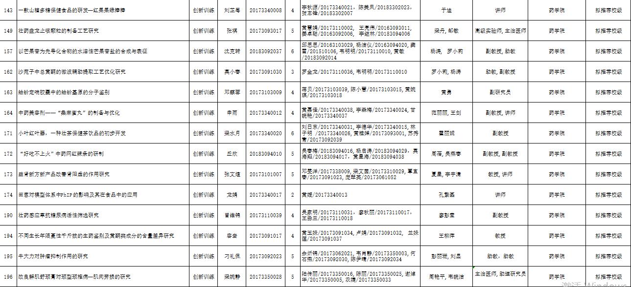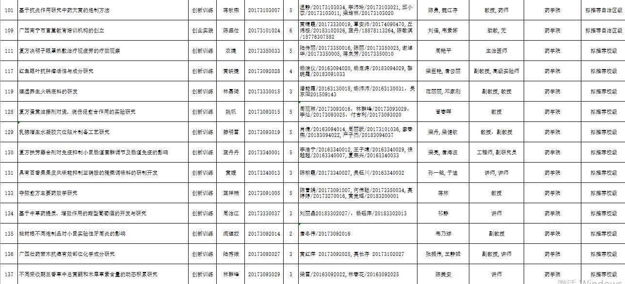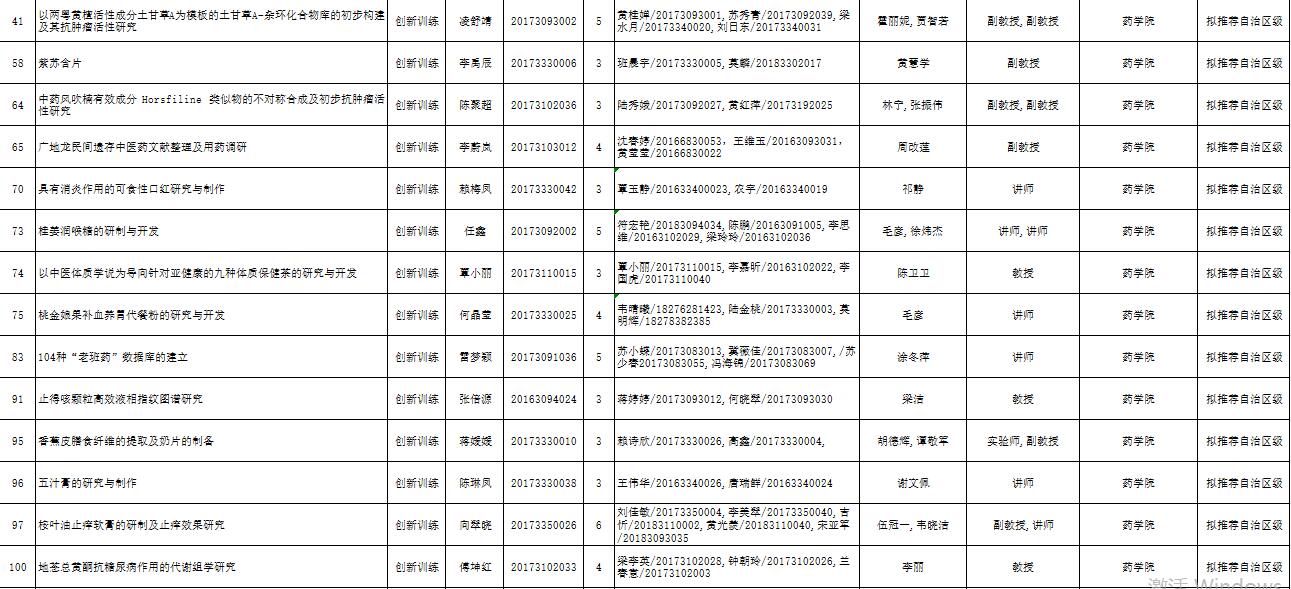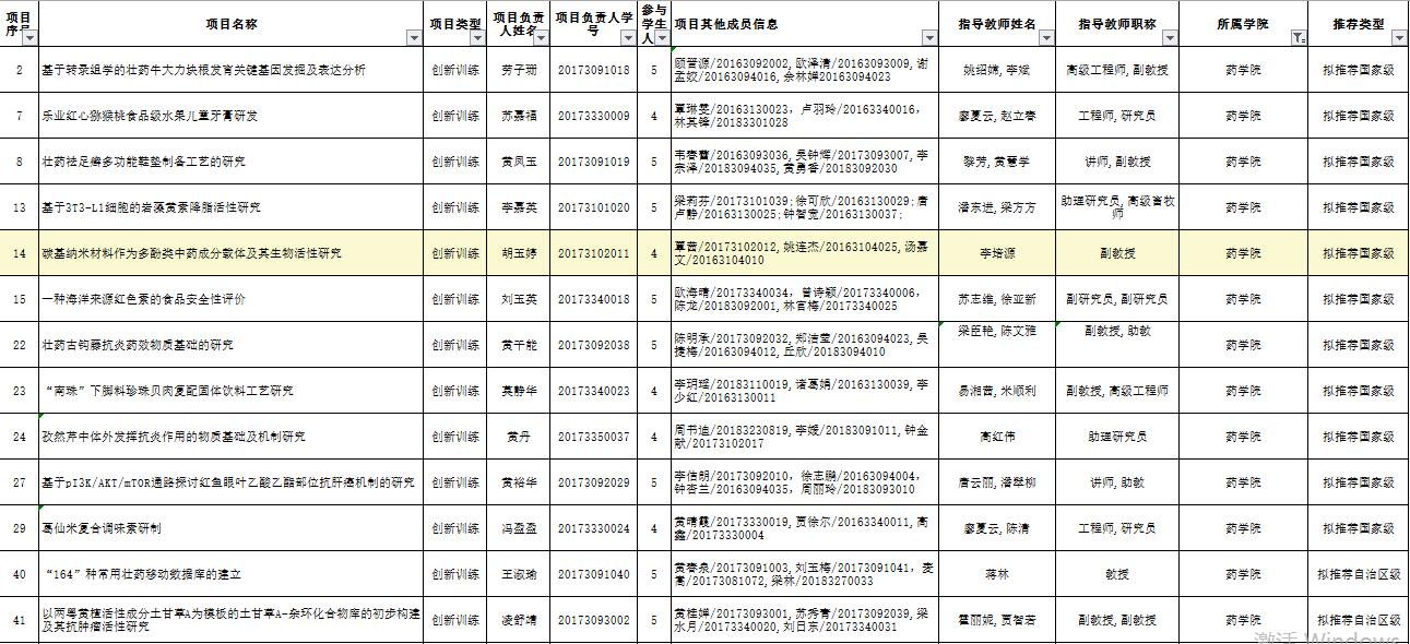 2019年3月,广西中医药大学开展了大学生创新创业训练计划申报项目。本次申报面向全校在校本科生。药学院学子相应学校号召积极参与大创项目,药学院的老师们在本次活动项目中竭尽全力给予学子们知识理论指导,在学校的政策支持以及药学院老师们的细心指导下,无数次的沟通与修改,药学院学子的努力终于传来捷报,获得了丰硕的成果。
