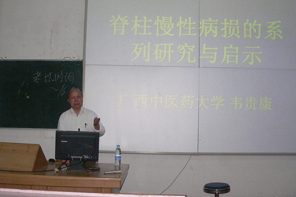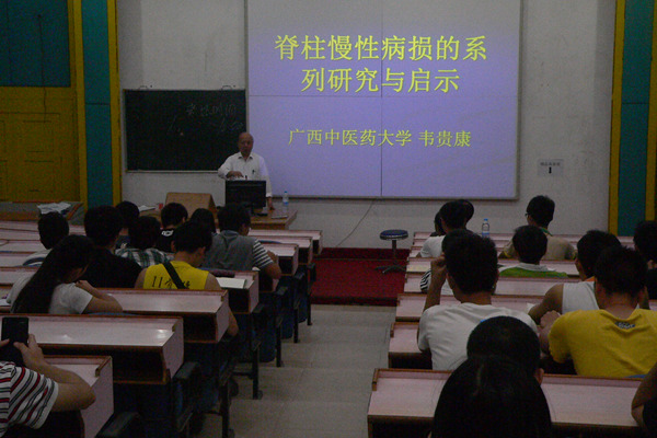 韦贵康教授系统介绍了脊柱相关疾病与脊柱慢性病损研究团队的形成发展,讲述了脊柱相关疾病的原理与临床研究,简介了“韦氏整脊十八法”、“韦氏奇穴”,以颈椎性血压异常的研究为切入点,结合多年的临床经历,展示了广西中医骨伤科学在脊柱慢性病损治疗与研究方面全国同类研究中处于领先水平的成就,展示了40年来广西中医骨伤科学研究的成果。同时,韦教授还深入浅出地讲述了整脊手法的操作与原则,中医药治疗脊柱与骨关节病损的实验与临床研究,以及整脊中力学原理的应用,讲演精彩纷呈,内涵丰富,拓宽了同学们的思路,大家觉得受益匪浅,现场掌声不时响起,反应热烈。