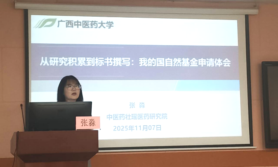 2025年11月7日上午,我平台张淼博士副研究员在广西中医药大学中医药壮瑶医药研究院举行2026年国家自然科学基金项目申报系列讲座做报告。